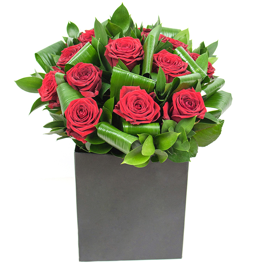 Brighten any room with our radiant red rose and green foliage bouquet, artfully arranged with vibrant red roses, rich aspidistra leaves, and soft ruscus. This unique arrangement offers a perfect blend of color and elegance, making it a standout choice for any occasion.